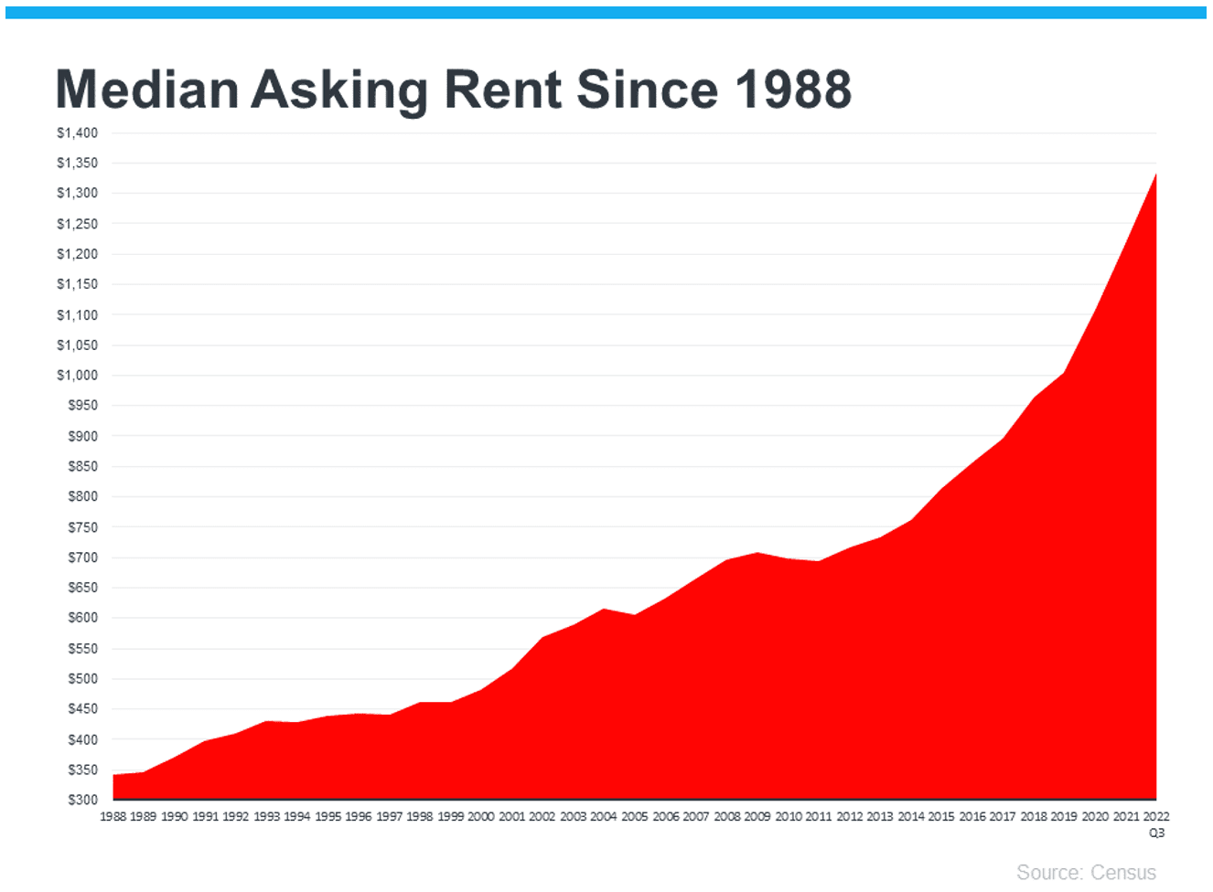 “Three out of four renters (74.2%) who have moved in the past 12 months reported seeing their rent increase. The strain from recent rent hikes isn’t exclusive to renters who have recently moved. Nearly two-thirds of renters (63.2%) who have lived in their current rental between 12 and 24 months, and likely renewed their lease, have also reported increases in their rent.”And if you look back at historical data, that shouldn’t come as surprise. That’s because, according to the Census, rents have been rising fairly consistently since 1988 (see graph below):