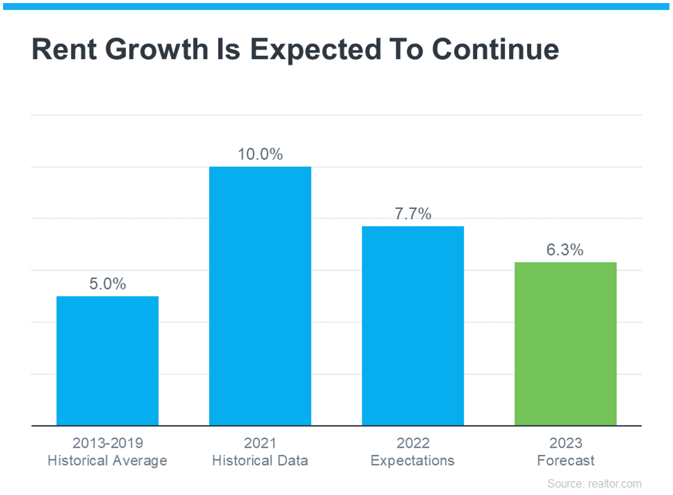 That forecast projects rents will increase by 6.3% in the year ahead (shown in green). When compared to the blue bars in the graph, it’s clear that the 2023 projection doesn’t call for an increase as drastic as the ones renters have seen over the past two years, but it’s still above the historical average for rent hikes between 2013-2019.