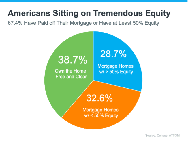 “. . . the average U.S. homeowner with a mortgage still has more than $300,000 in equity . . .”Clearly, homeowners have a lot of equity right now. The latest data from the Census and ATTOM shows over two-thirds of homeowners have either completely paid off their mortgages (shown in green in the chart below) or have at least 50% equity (shown in blue in the chart below):
