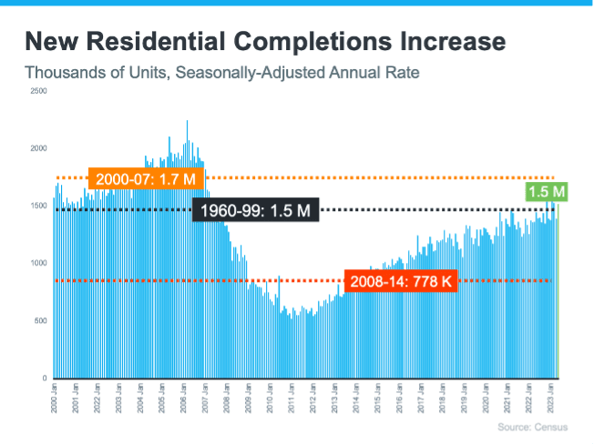 Here’s a look at a key metric that shows just how much new home construction is ramping up nationwide. It’s called new residential completions. Basically, completions are newly built homes that are finished and ready to move into.The graph below uses data from the Census to show the trend of new-home completions over time, including the long-term average for the number of finished housing units (shown in black on the graph):