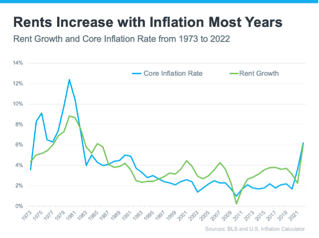 The alternative to homeownership is renting – and rents tend to move alongside inflation. That means as inflation goes up, your monthly rent payments tend to go up, too (see graph below):